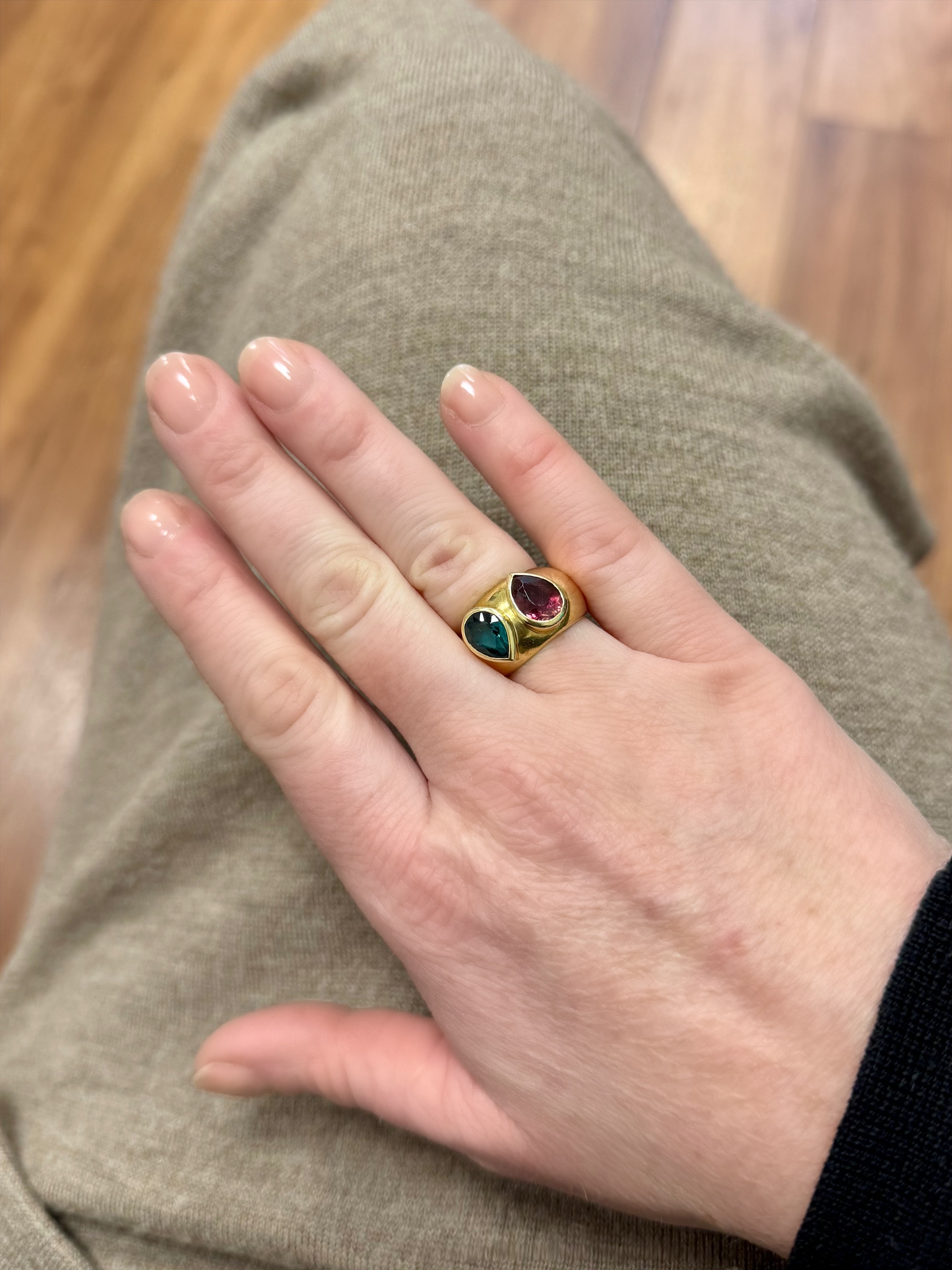 Superbe bague des années 1970 en or jaune 18K sertie de deux belles tourmalines poires, une rose intense et une bleu-vert dit "indigolite".