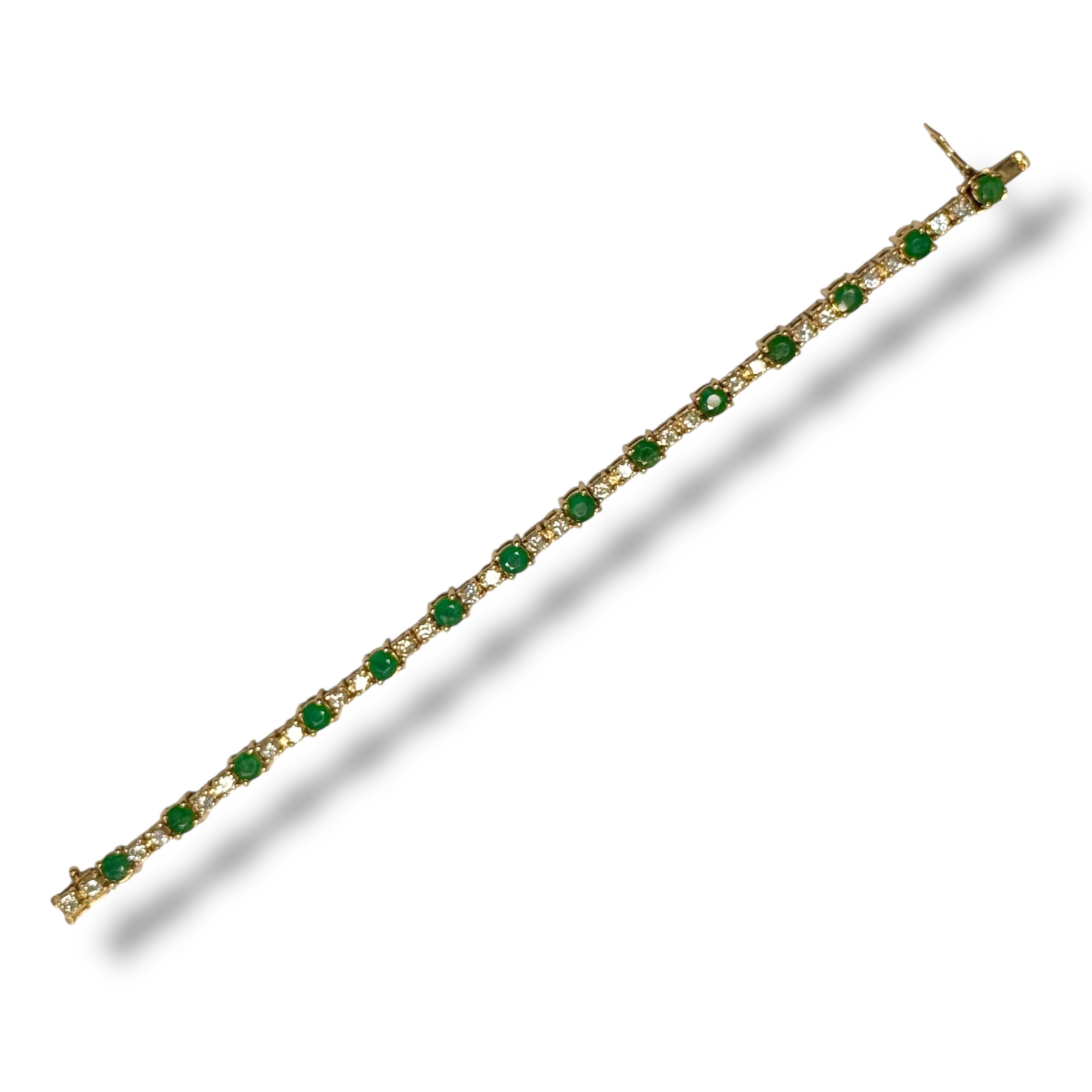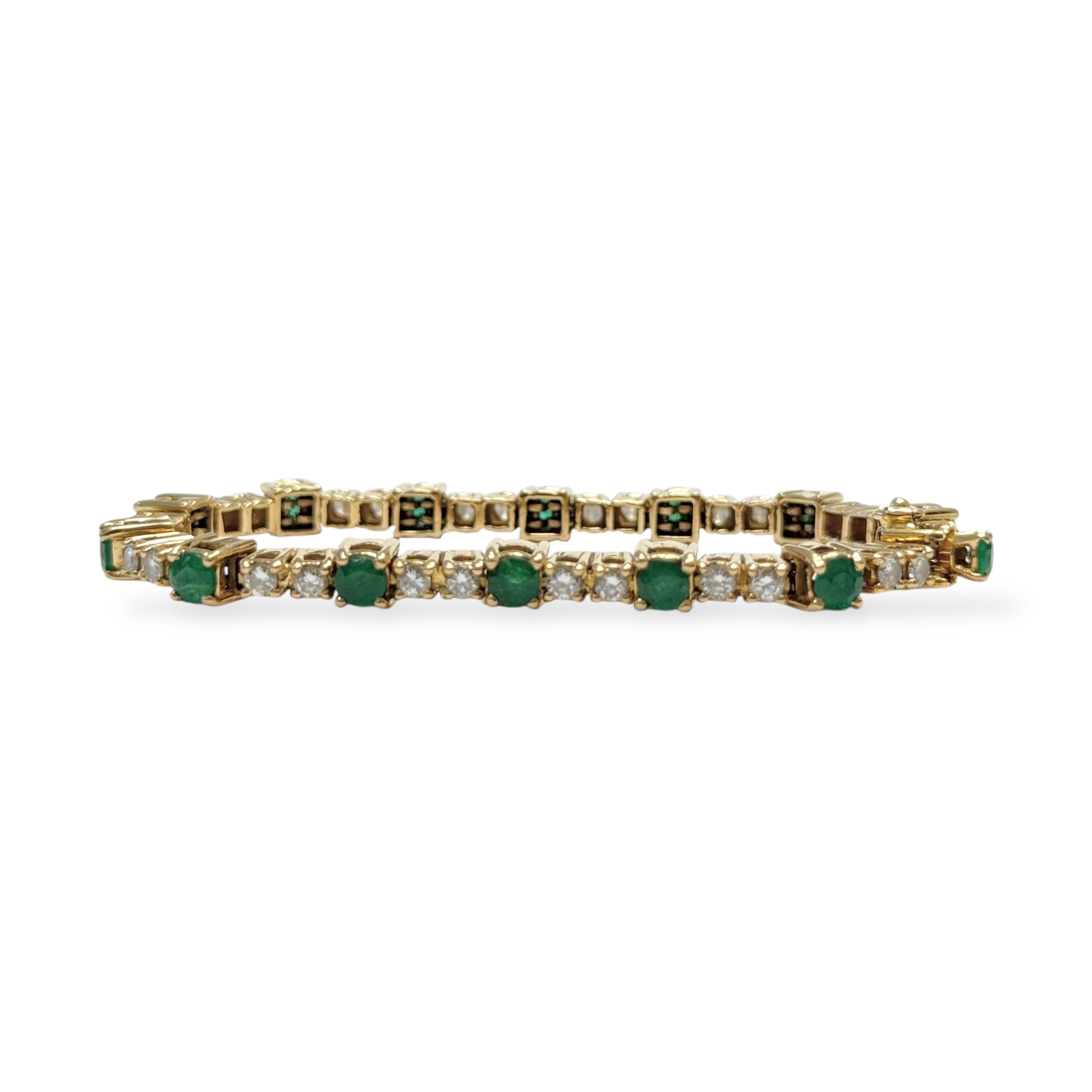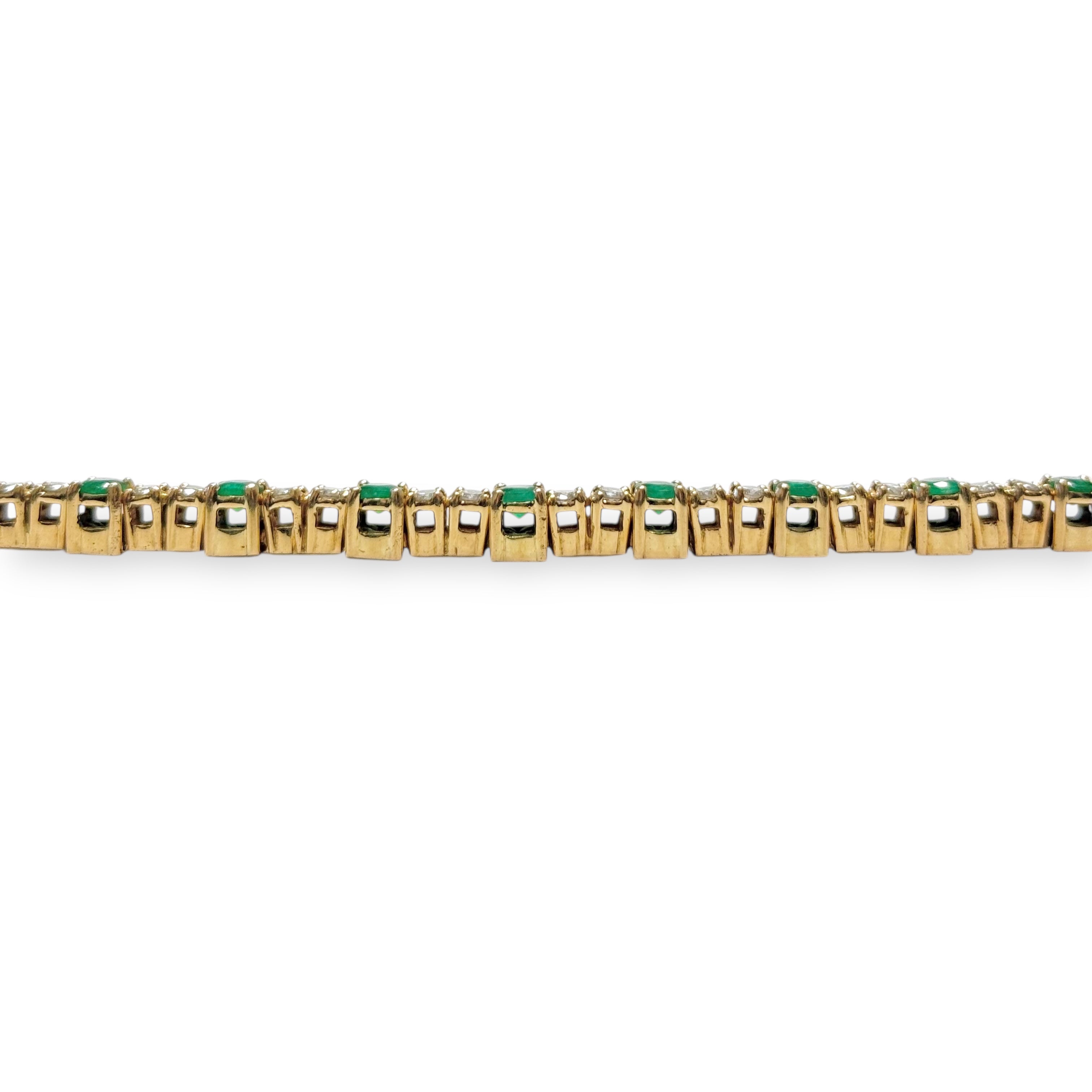 Superbe bracelet en or jaune 18K entièrement serti de 28 diamants ronds pesant environ 0,06 carats chacun (estimé) alternant 14 émeraudes rondes facettées pesant quant à elle environ 0,20 carats chacune (estimé).
