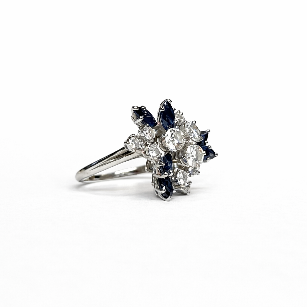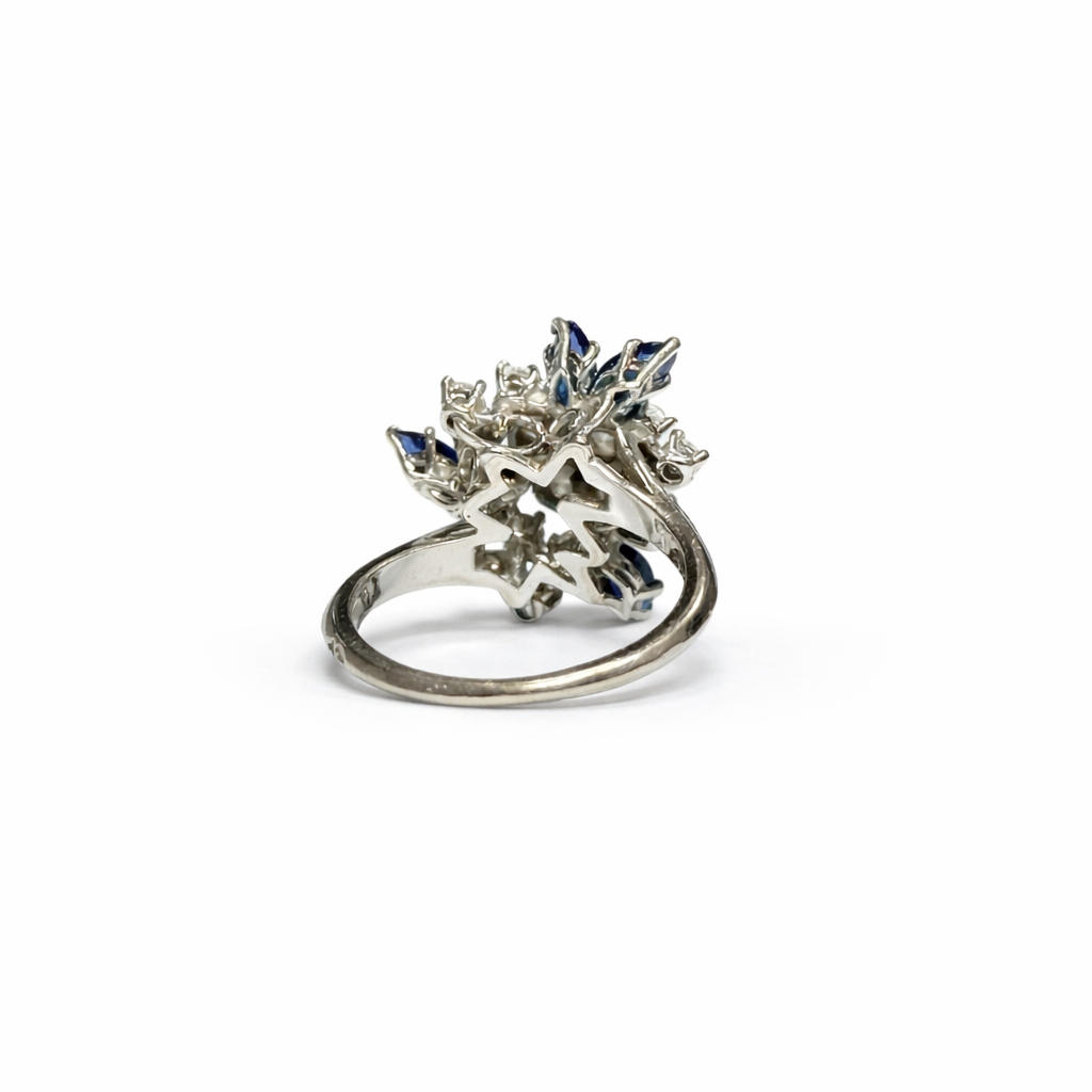Exceptionnelle bague en or gris 18K et platine 950 sertie de diamants taille ancienne et de saphirs taille navette, arrangés en un bouquet explosif et délicat.