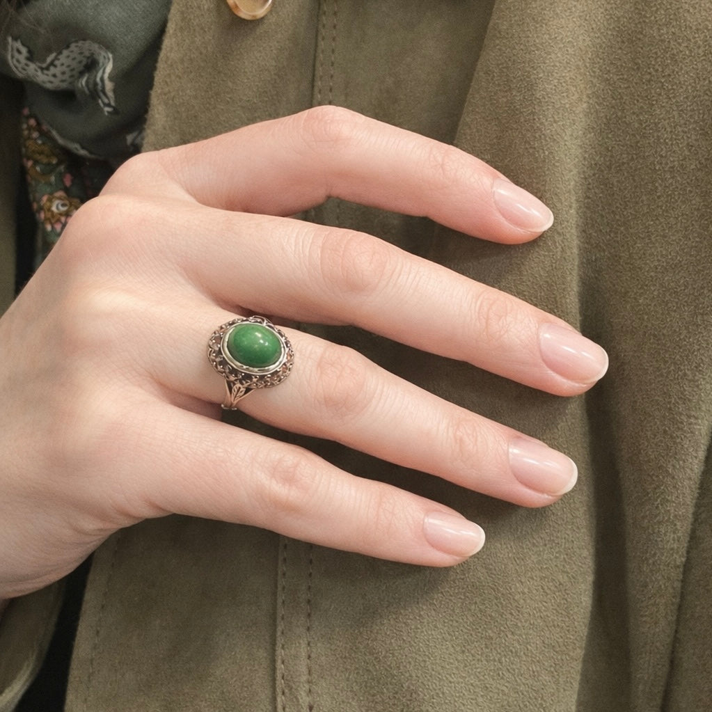Pretty old ring in 18K yellow gold and white gold, adorned with a green turquoise cut into a cabochon, the assembly in a closed setting.