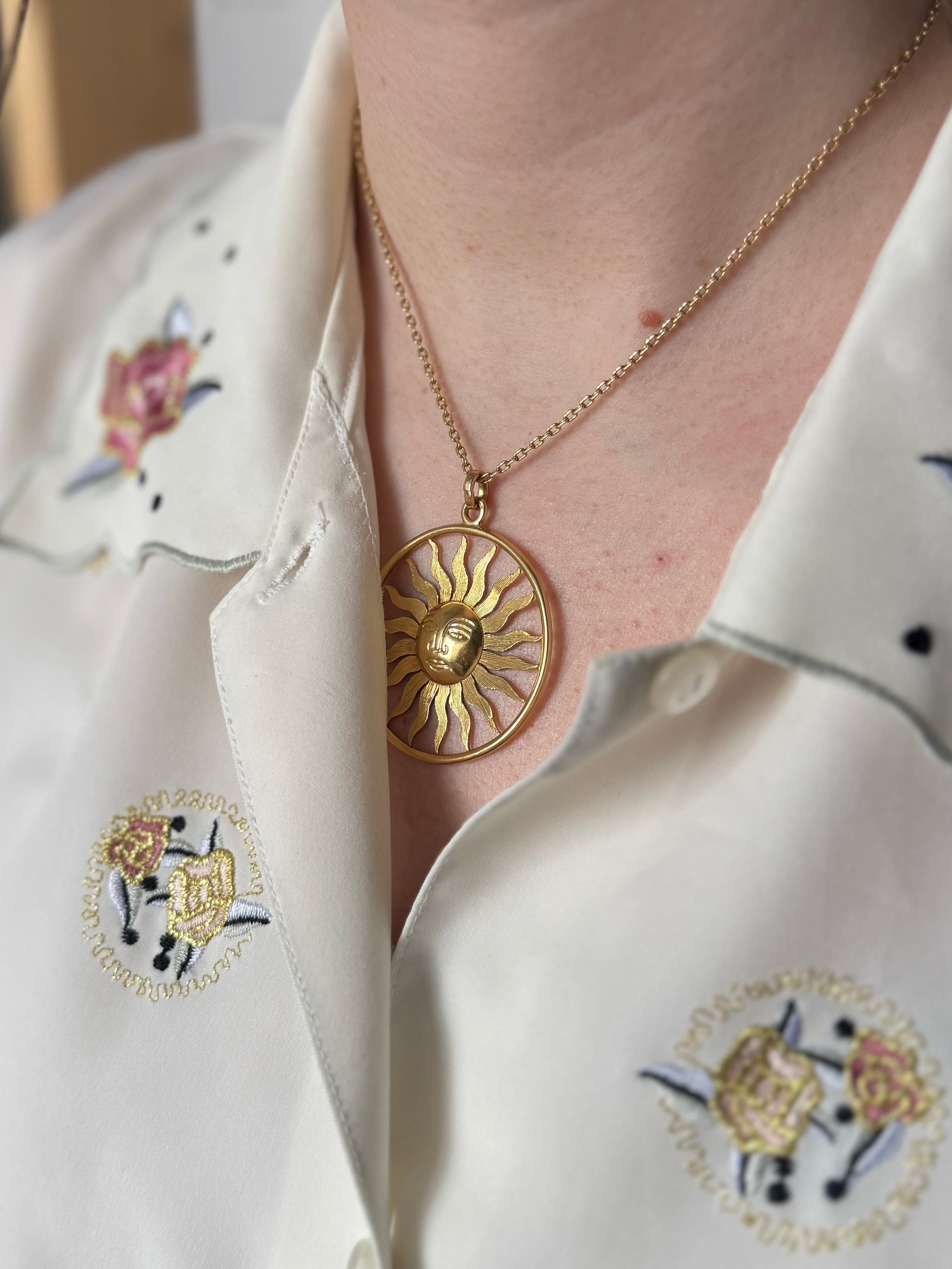 Important pendentif rond en or jaune 18K à motif d'un soleil stylisé.
